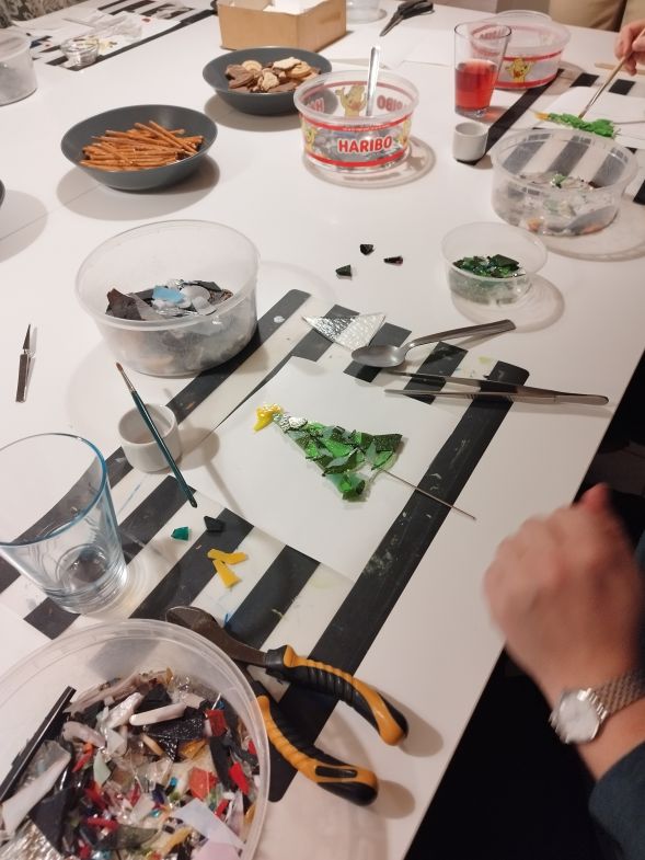 I kan også tage jeres børn/børnebørn med, hvis de kan koncentrere sig om at sidde og sætte glasstykkerne sammen til fine figurer og glasbilleder.